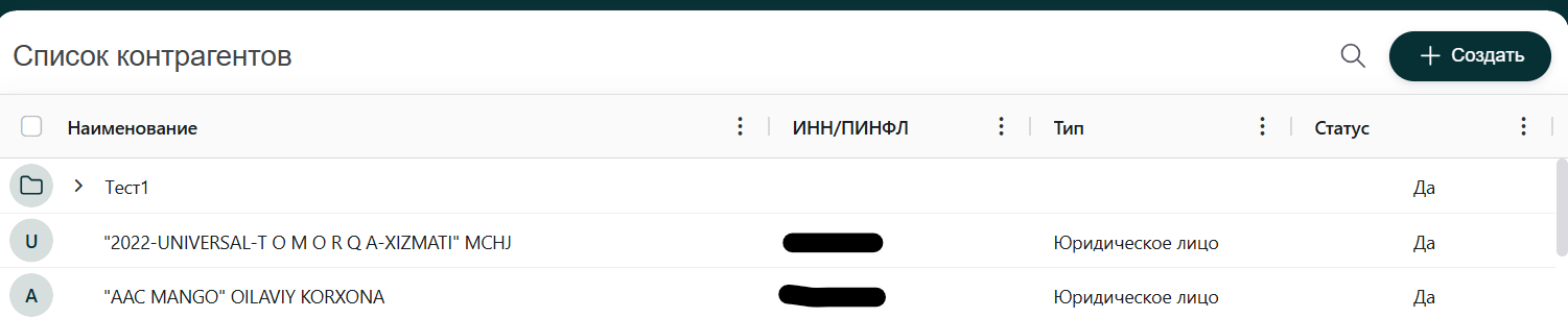 - Для поиска контрагента введите его имя или ИНН/ПИНФЛ в строку поиска.