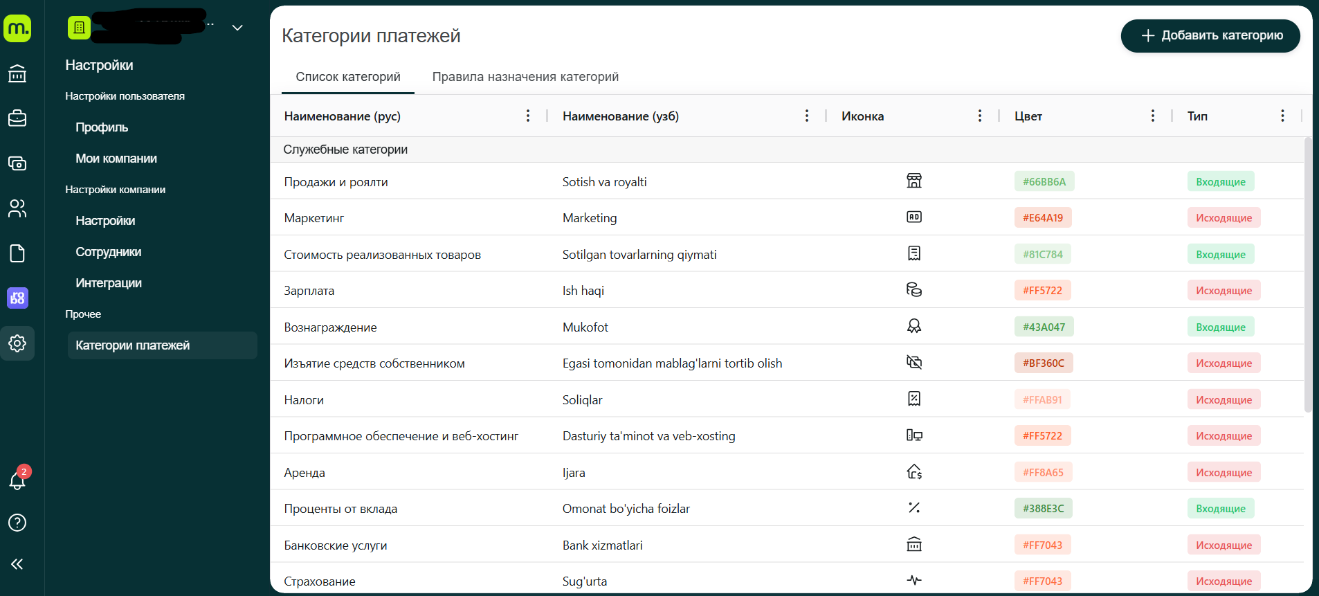Страница "Категории платежей" предназначена для управления категориями финансовых операций. Здесь пользователь может просматривать, редактировать и добавлять новые категории платежей.
