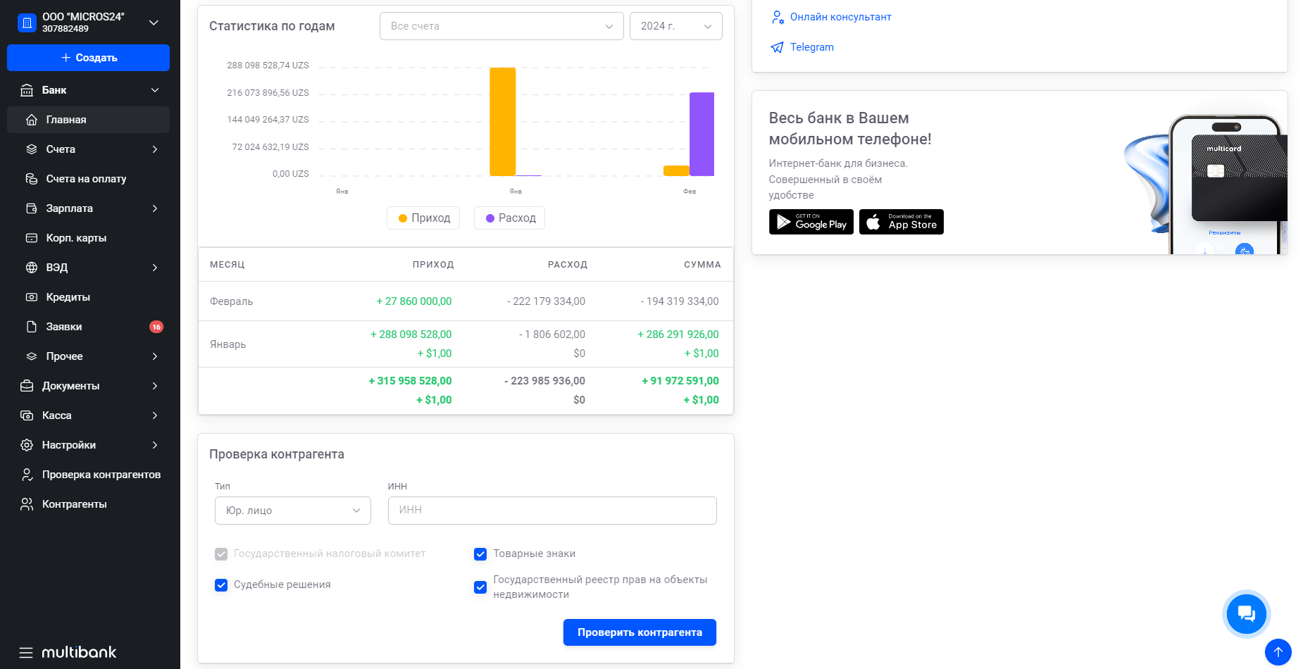 • На главной странице, мы видим банковские счета, последние платежи, курс валют, проверку контрагента, статистику по учетным статьям и по годам.