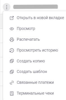- Нажав на три точки слева каждого платежа, можно открыть платеж в новой вкладке, распечатать его, просмотреть историю, связанные платежи и терминальные чеки. На определенных платежах, вы можете также создать копию или шаблон платежа.