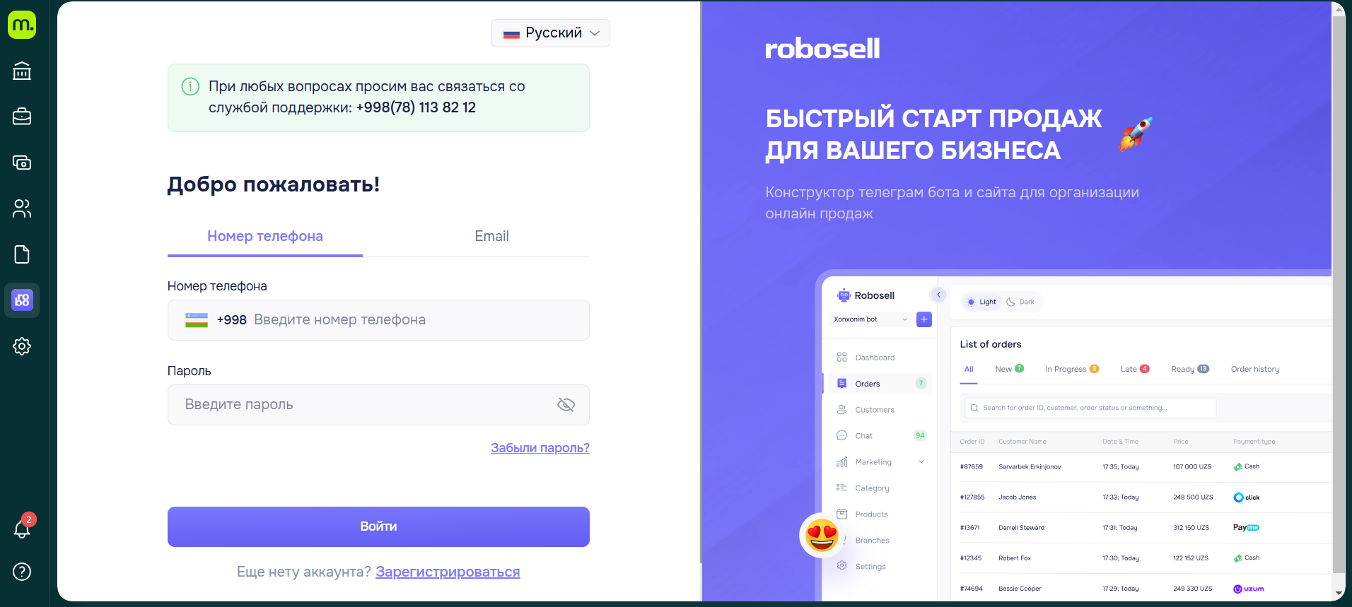Экран входа в систему Robosell - платформы для управления онлайн-продажами через Telegram-бота и веб-сайт. Пользователь может войти с помощью номера телефона и пароля, восстановить доступ или зарегистрироваться. Справа - обзор интерфейса с заказами и основными функциями.