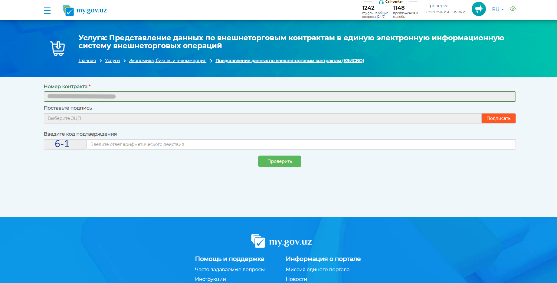 • При нажатии на контракт, открывается новая вклада на my.gov.uz, сайт представляет данные по внешнеторговым контрактам в единую электронную информационную систему внешнеторговых операций.