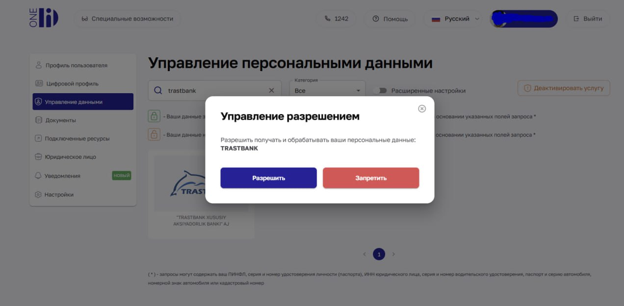 Для полноценного использования услуг дистанционного банковского обслуживания (ДБО) необходимо предоставить банку разрешение на обработку данных через систему OneID.
