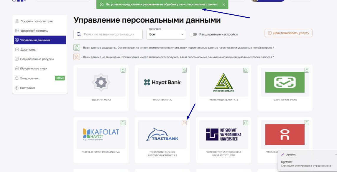 Доступ в OneID для услуг Трастбанка