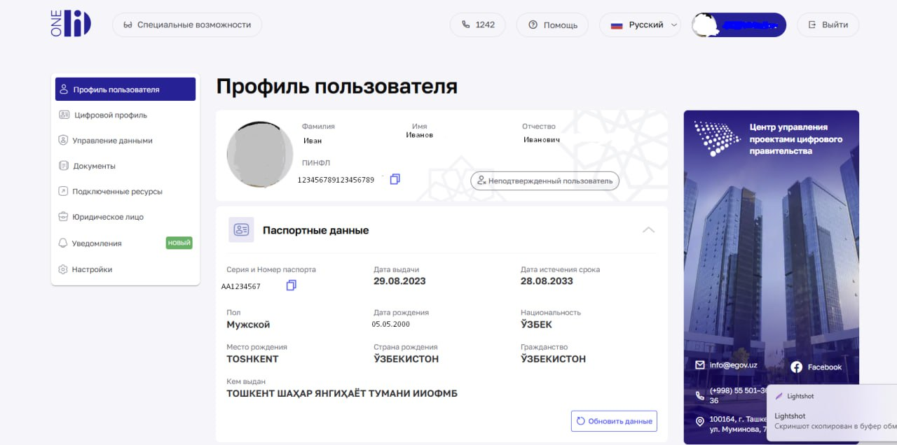 • Переход в настройки: После успешного входа на главной странице OneID перейдите в раздел «Управление данными».