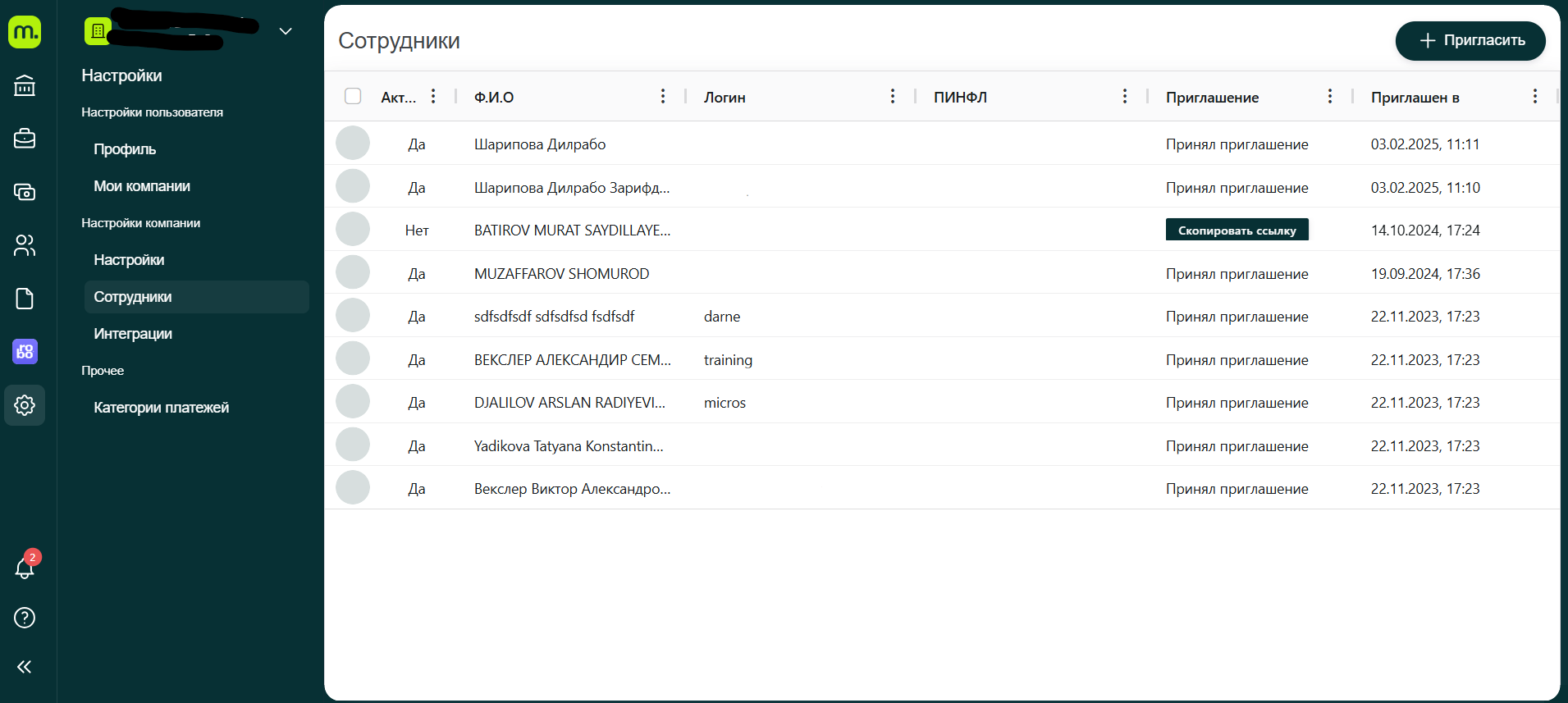 • Добавление новых сотрудников с помощью кнопки "+ Пригласить".